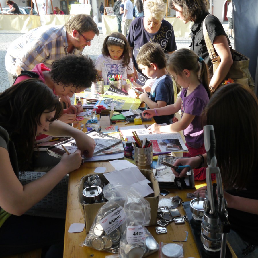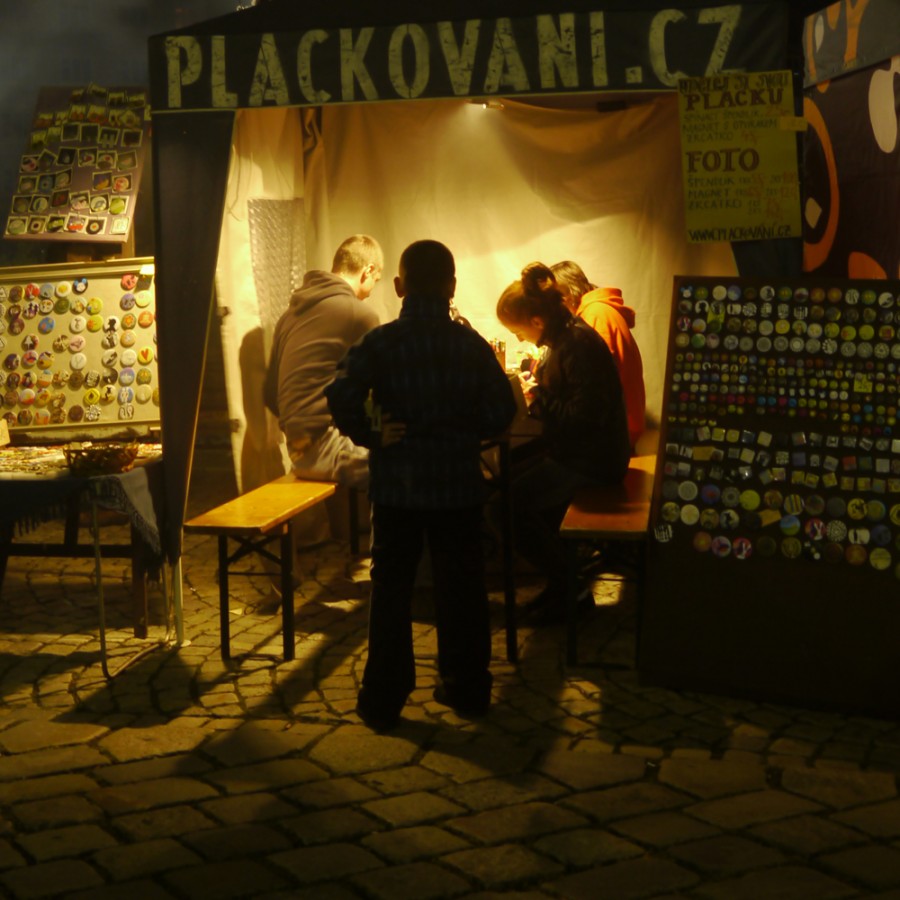 Jsme skupina výtvarníků, kteří svoje práce prezentují na buttonech. Naše buttony jsou autorské, netradiční. Vyrábíme několik velikostí, naše buttony jsou vyrobeny z různých materiálů a technologií. Kromě buttonů nabízíme celou řadu naušnic. Součástí našeho stánku je také workshop, kde si návštěvníci mohou vyrobit svoji originální placku. Další z možností je i nechat se vyfotografovat a domů si odnést placku s fotografií. Což může být i pěkný dárek k Vánocům.